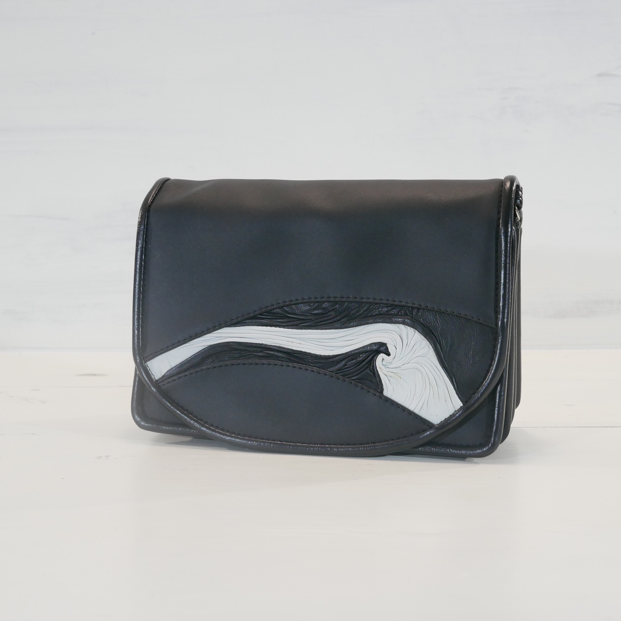 Kabelka je vyrobena v kombinaci kůže-koženka ve černé barvě. Přední díl - klopa je zdobena ručně mačkanou kůží (černá, bílá). Kabelka je uzavíratelná na magnet pod klopou. Kabelka má dlouhý řemen přes rameno se zkracovačem.