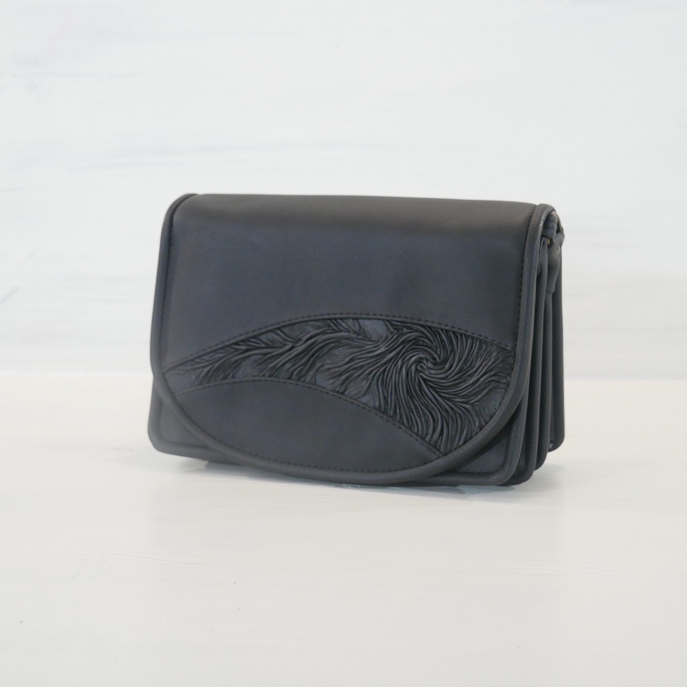 Kabelka je vyrobena v kombinaci kůže-koženka ve černé barvě. Přední díl - klopa je zdobena ručně mačkanou kůží (černá). Kabelka je uzavíratelná na magnet pod klopou. Kabelka má dlouhý řemen přes rameno se zkracovačem.