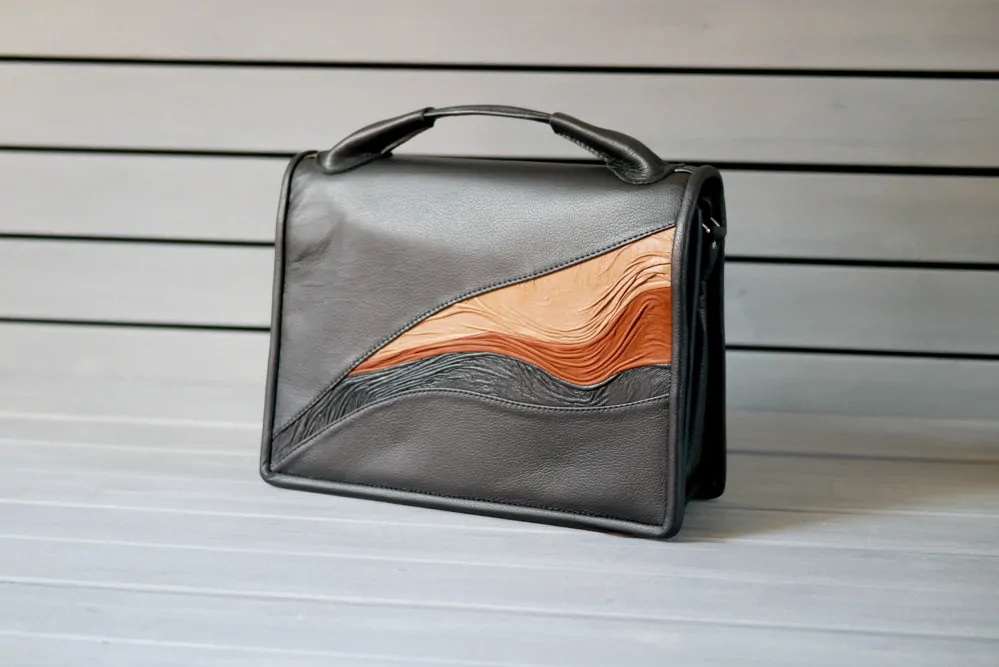 Marika je střední kabelka vyrobena kompletně z pravé kůže v základní černé barvě. Přední díl - klopa je zdobena ručně mačkanou kůží v černé, sv. hnědé a hnědé barvě. Do kabelky se vejdou dokumentu formátu A4. Pokud se Vám nechce nosit kabelku za ucho, lze vždy využít řemen přes rameno se zkracovačem.
