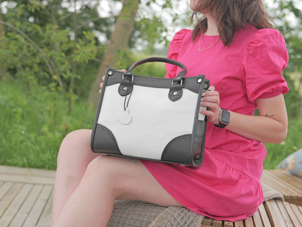 Městská business kabelka Rorita jevyrobena z prémiové bílé a černé kůže. Barevností je velmi střídmá.