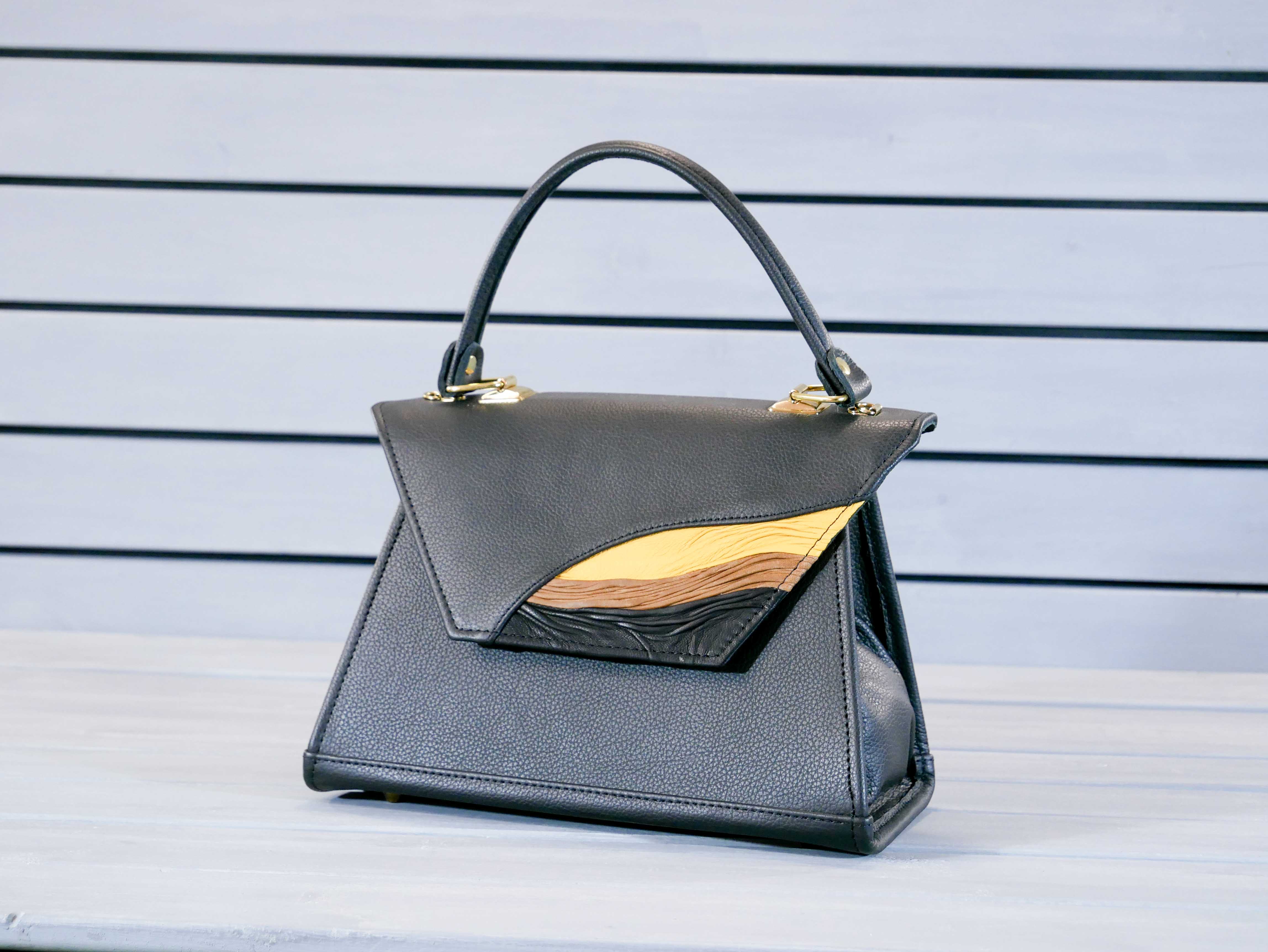 Na krásné věci se holt musí počkat. Tahle kráska čekala rok než jsme ji dovedli k dokonalosti. Elegantní parťačka na sobotní večer, na ples, do opery, na večírek nebo na filmový festival v Cannes. Cokoli. Originální tvar, přesná velikost, žádné přebytečné ozdoby, jen čistá jednoduchost. A materiál? Co jiného než naše poctivá černá hovězinová kůže. Hlavní gró celého výrobku je lichoběžníková klopa, která je v tomto případě s originální ručně mačkanou kůží v černé, hořčicové a hnědé barvě. Decentní a přesto není nudná.