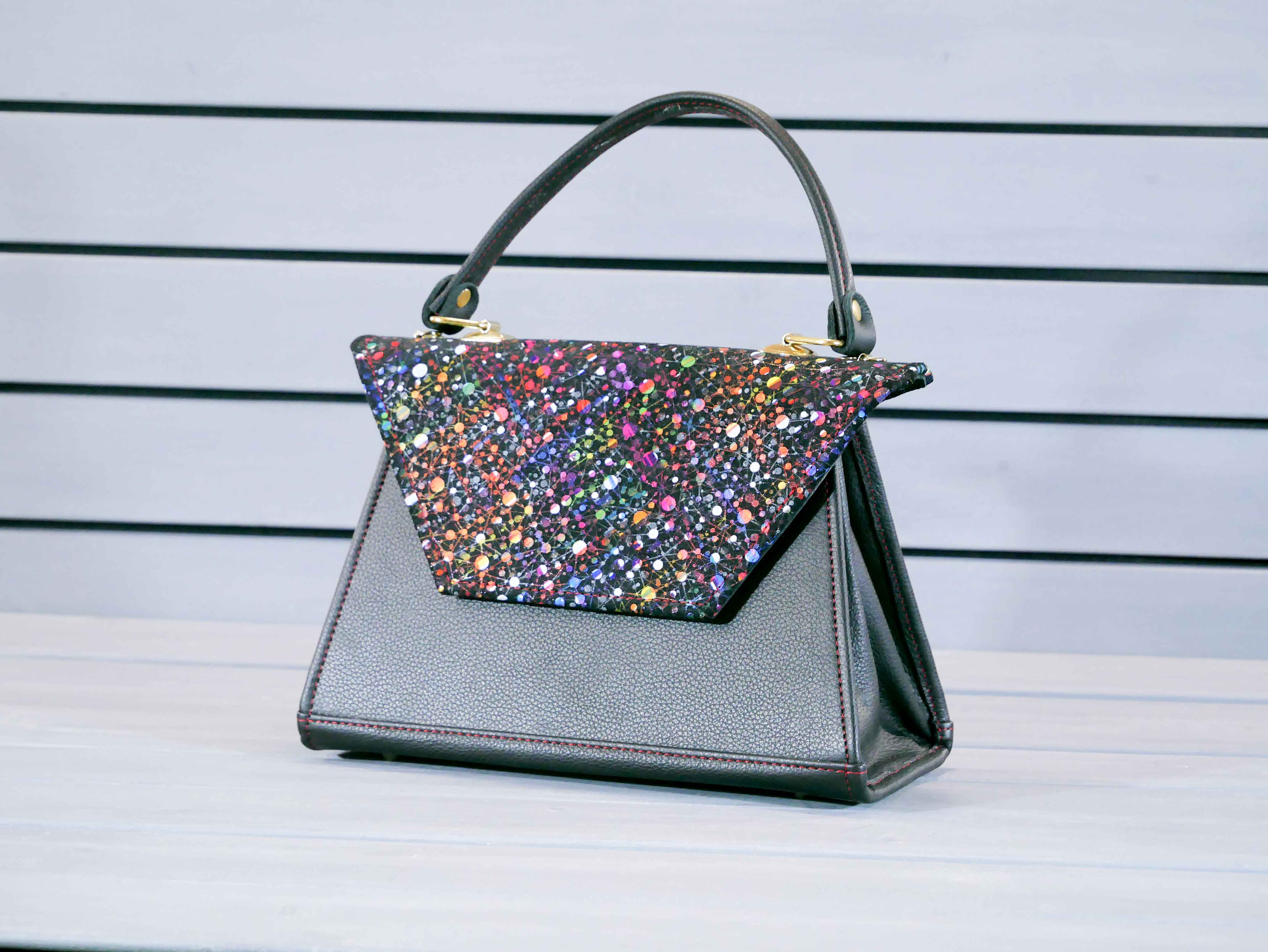 Na krásné věci se holt musí počkat. Tahle kráska čekala rok než jsme ji dovedli k dokonalosti. Elegantní parťačka na sobotní večer, na ples, do opery, na večírek nebo na filmový festival v Cannes. Cokoli. Originální tvar, přesná velikost, žádné přebytečné ozdoby, jen čistá jednoduchost. A materiál? Co jiného než naše poctivá černá hovězinová kůže. Hlavní gró celého výrobku je lichoběžníková klopa, která je v tomto případě z pestrobarevné hovězinové kůže se vzorem. Decentní a přesto není nudná.