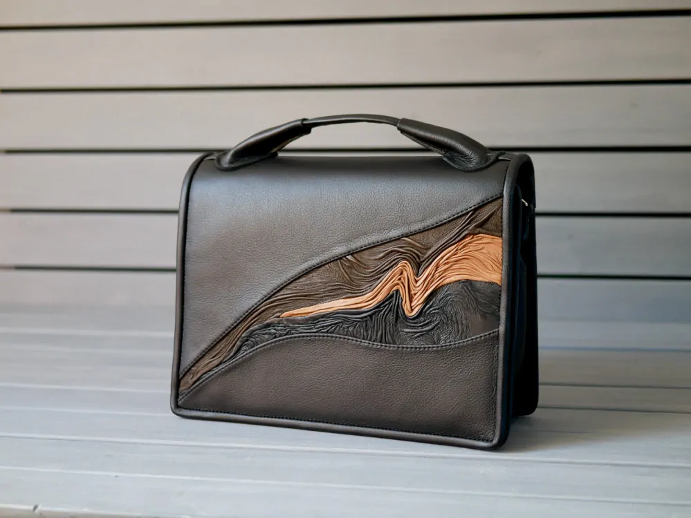 Marika je střední kabelka vyrobena kompletně z pravé kůže v základní černé barvě. Přední díl - klopa je zdobena ručně mačkanou kůží v černé, tmavě hnědé a světle hnědé barvě. Do kabelky se vejdou dokumentu formátu A4. Pokud se Vám nechce nosit kabelku za ucho, lze vždy využít řemen přes rameno se zkracovačem.