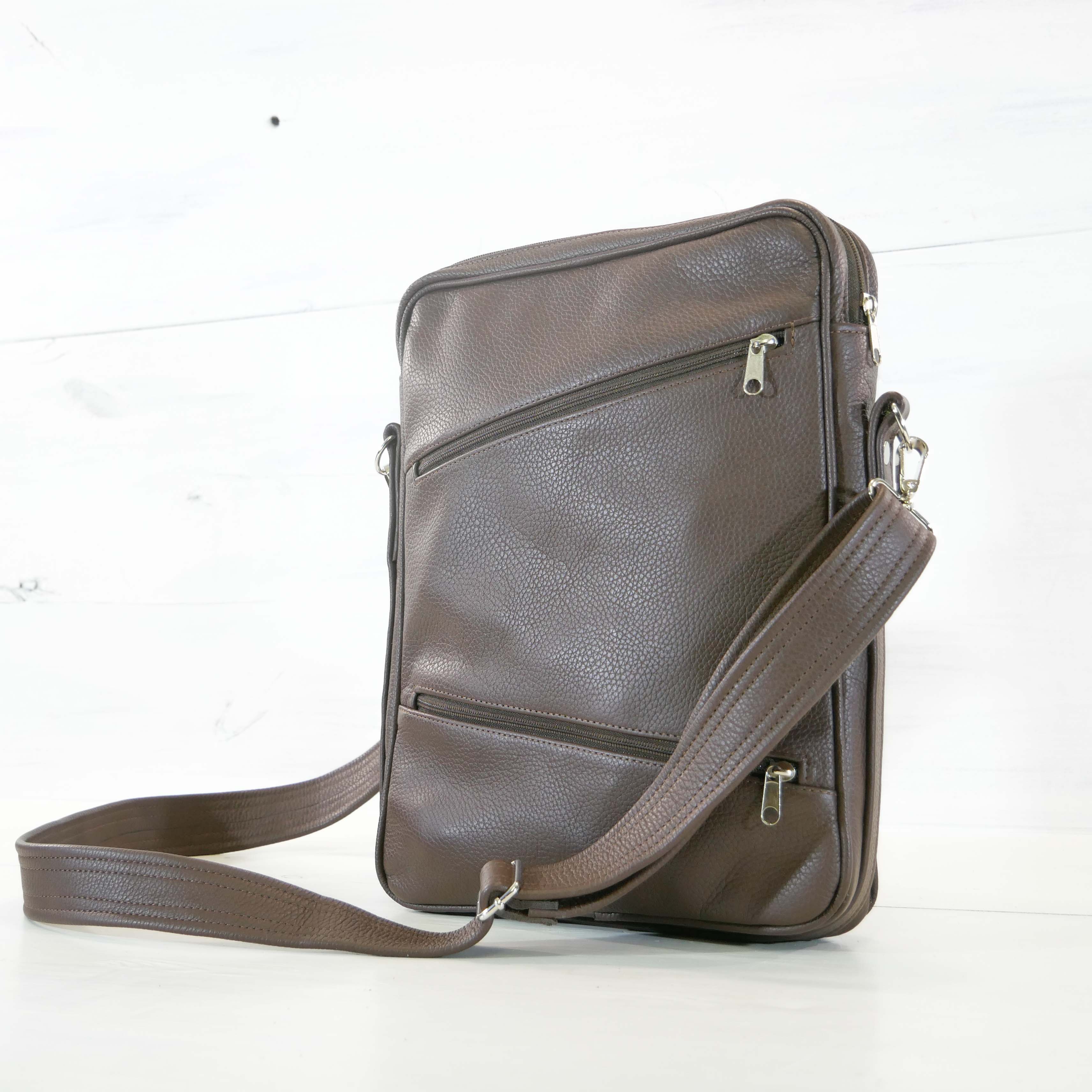 Pánská brašna Noel je vyrobená kompletně z pravé kůže v odstínu hořká čokoláda. Velmi objemná taška pro Vaše osobní potřeby, několik dokumentů, menší láhev vody a jiné věci. Dostatečně široký popruh zajistí pohodlné nošení přes rameno, který se dá zkracovat. Na přední straně jsou na zipy uzavíratelné kapsy, kam lze schovat menší předměty jako klíče, kapesníčky,... Uvnitř brašny je komora naprosto volná uzavíratelná na zip, vejdou se do ní dokumenty A4. Uvnitř je černá bavlněná podšívka.