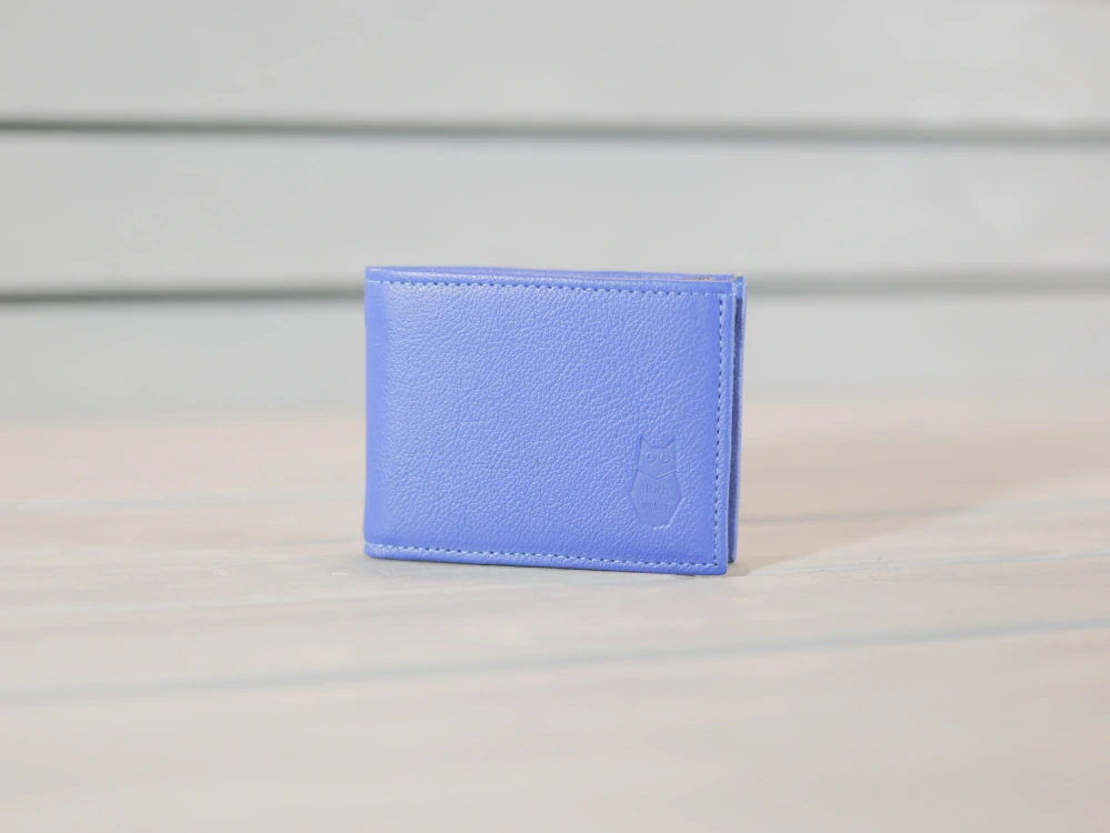Pánská peněženka je vyrobena z hladké modré hovězinové kůže. Vnitřek peněženky je v tmavě šedé kůži. Verze peněženky s výklopnou kapsou je navržena pro zákazníky, kteří upřednostňují více přihrádek na platební karty a zároveň i kapsičku na drobné. Peněženka tedy má v základním rozvržení oddíl na mince, oddíl na čtyři platební karty a navíc výklopnou kapsičku, která přidává oddíl na čtyři platební karty a průsvitnou fólii na fotografie, doklady či jiné dokumenty. Samozřejmostí jsou i dva oddíly na bankovky předělené přepážkou. Do peněženky se s lehkostí nechají vložit, jak české bankovky nejvyšší nominální hodnoty, tak i eurobankovky.