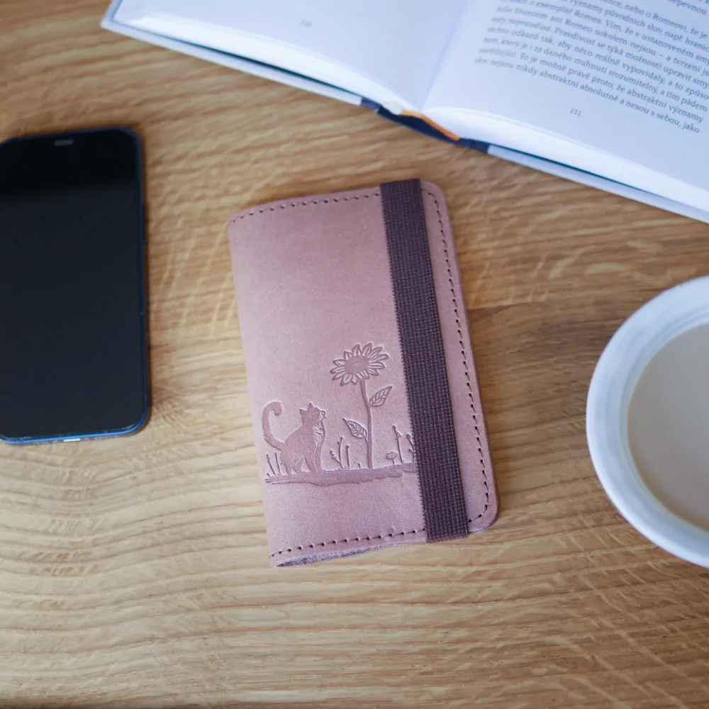 Zápisník se zavírá na hnědou gumičku, která pevně obepíná obal. Na přední straně obalu je navíc vyražen motiv kočičky.